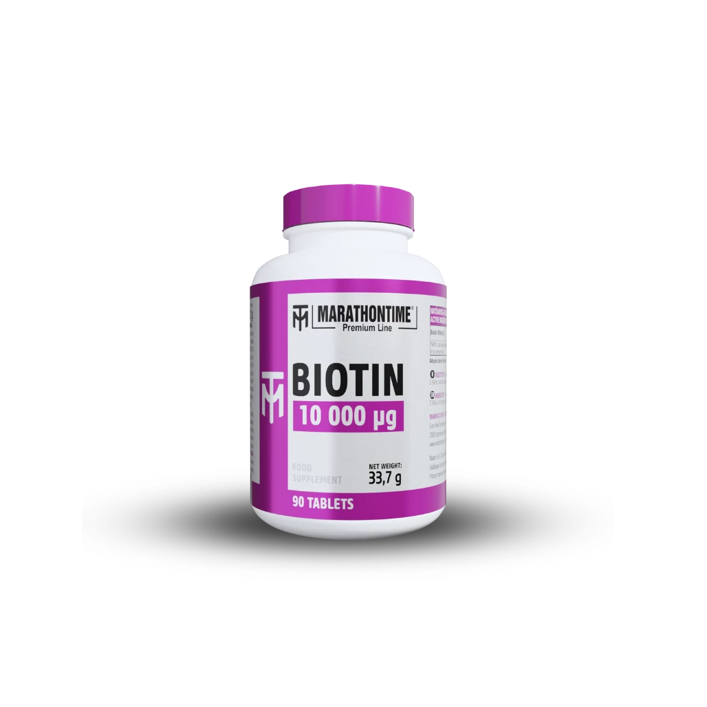 Biotin 10 mg – 90 tabletta egy magas hatóanyag-tartalmú biotin (B₇-vitamin) étrend-kiegészítő tabletta. Minden tabletta 10 000 µg (10 mg) biotint tartalmaz, amely 20 000%-ban fedezi a napi beviteli referenciaértéket. A biotin hozzájárul a haj és a bőr normál állapotának fenntartásához. 90 tablettás kiszerelés – napi 1 tabletta bevételével három hónapra elegendő, kúraszerű használatra ajánlott.