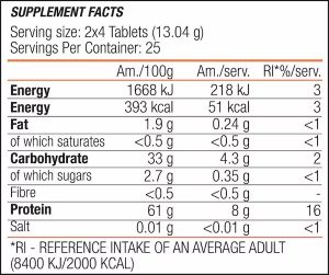 Összetevők: hidrolizált marha fehérje (89%), maltodextrin, csomósodásgátló anyag (szilicium-dioxid, zsírsavak magnéziumsói), bevonat (sűrítő anyag: metil-cellulóz, polidextróz, hidrogénezett kókuszolaj és pálmamagolaj, színezék, ammónia karamell