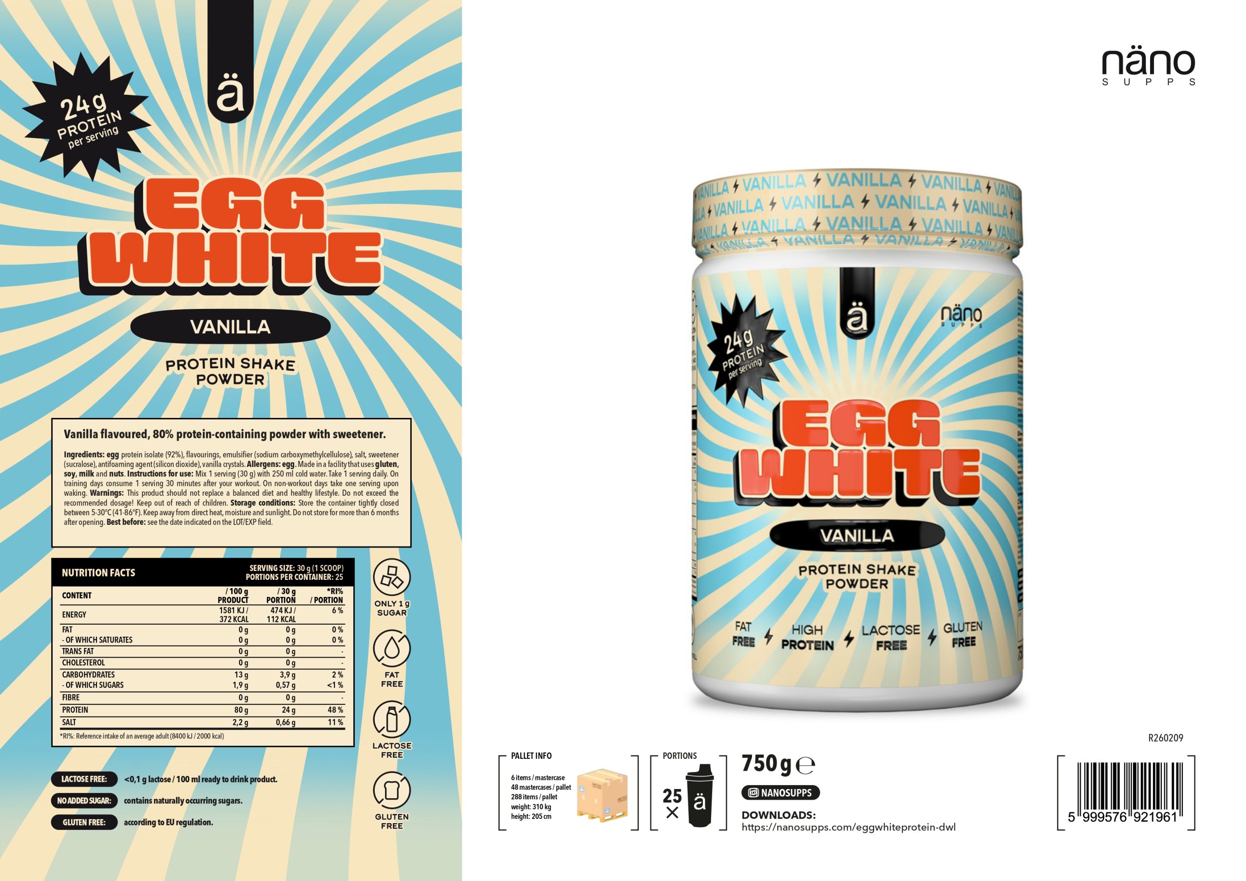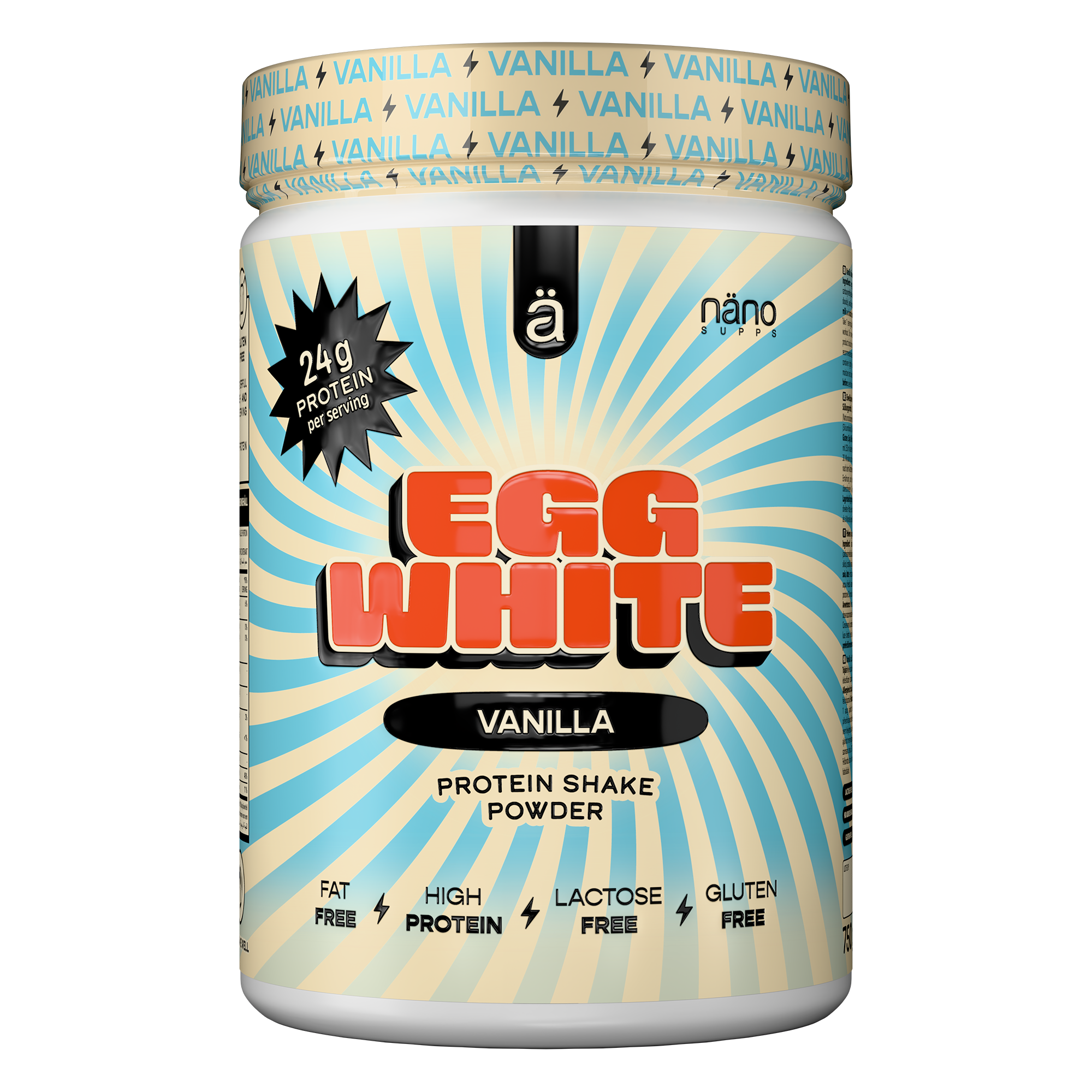 - Vanília ízű, 80%-ban fehérjetartalmú por édesítőszerrel. Összetevők: tojásfehérje-izolátum (92%), aromák, emulgeálószer (nátrium-karboximetil-cellulóz), só, édesítőszer (szukralóz), habzásgátló (szilícium-dioxid), vanília kristályok. Allergének: tojás. Glutént, szóját, tejet és dióféléket feldolgozó üzemben készült. Használati utasítás: Keverjen el 1 adagot (30 g) 250 ml hideg vízzel.